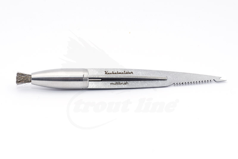 The front stainless steel brush offers sensitive, controlled brushing—perfect for fine work on CDC feathers or small fly parts, where precision matters most. Like writing with a fountain pen, it lets you work with accuracy and lightness. The small round brush is ideal for bending hair and refining CDC.